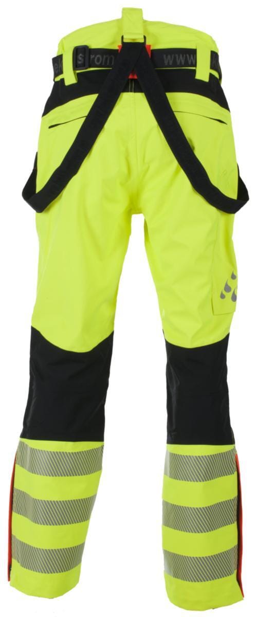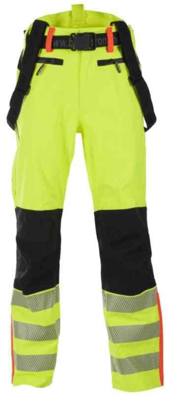 Skallbukse i moderne design. Pustende, vind- og vanntett. Tapede sømmer. Vannsøyle 13 000 mm, pustende evne 8000 g/m²/24t. Forlenget rygg. Justerbare elastiske seler, avtakbare. Gylf med YKK® glidelås, knapp i linning. Brede beltehemper. Belte med plastspenne, avtakbart. To horisontale lommer foran med åpning til hengelommer, begge med vanntett glidelås. To baklommer med klaff og glidelås. Tommestokklomme med drenering. Vanntett glidelås i sidene for ventilering. Støvelglidelås i benavslutning. 50 mm 3M Scotchlite™ transferrefleks på ben.