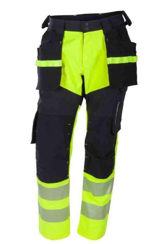 Håndverksbukse med formsydde ben og materiale i 4-veis stretch for optimal bevegelighet. Metervare med bomull og viskose innside for optimal komfort. To-nålssøm i ben, lommer og skritt. Forsterket i skritt med kile. YKK® glidelås i gylf og to trykknapper i linning. Brede beltehemper. Hempe med borrelås til hammerholder i begge sider i linning. To forlommer i 4-veis stretch materiale. To hengelommer i Cordura® forsterket med dobbel bunn, begge med ett fakk, tre hylsterlommer og tre hemper. Tommestokklomme i Cordura® med knapp og hempe for kniv og liten utvendig lomme, delvis festet for optimal bevegelighet. To baklommer i 4-veis stretch materiale, begge med klaff og borrelås. Lårlomme i 4-veis stretch materiale med innvendig mobiltelefonlomme og klaff med borrelås, delvis festet for optimal bevegelighet. Kneputelommer i 2-veis stretch PA Cordura® med innputt fra innsiden. 70 mm 3M™ Scotchlite™ segmentert påtrykket refleks på ben. Hempe innvendig bak i linning.