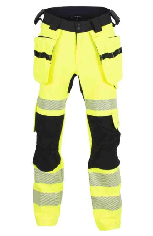 Håndverksbukse med formsydde ben og materiale i 4-veis stretch for optimal bevegelighet. Metervare med bomull og viskose innside for optimal komfort. To-nålssøm i ben, lommer og skritt. Forsterket i skritt med kile. YKK® glidelås i gylf og to trykknapper i linning. Brede beltehemper. Hempe med borrelås til hammerholder i begge sider i linning. To forlommer i 4-veis stretch materiale. To avtagbare hengelommer i Cordura® forsterket med dobbel bunn, begge med ett fakk, tre hylsterlommer og tre hemper. Tommestokklomme i Cordura® med knapp og hempe for kniv og liten utvendig lomme, delvis festet for optimal bevegelighet. To baklommer i 4-veis stretch materiale, begge med klaff og borrelås. Lårlomme i 4-veis stretch materiale med innvendig mobiltelefonlomme og klaff med borrelås, delvis festet for optimal bevegelighet. Kneputelommer i 2-veis stretch PA Cordura® med innputt fra innsiden. 70 mm 3M™ Scotchlite™ segmentert påtrykket refleks på ben. Hempe innvendig bak i linning.