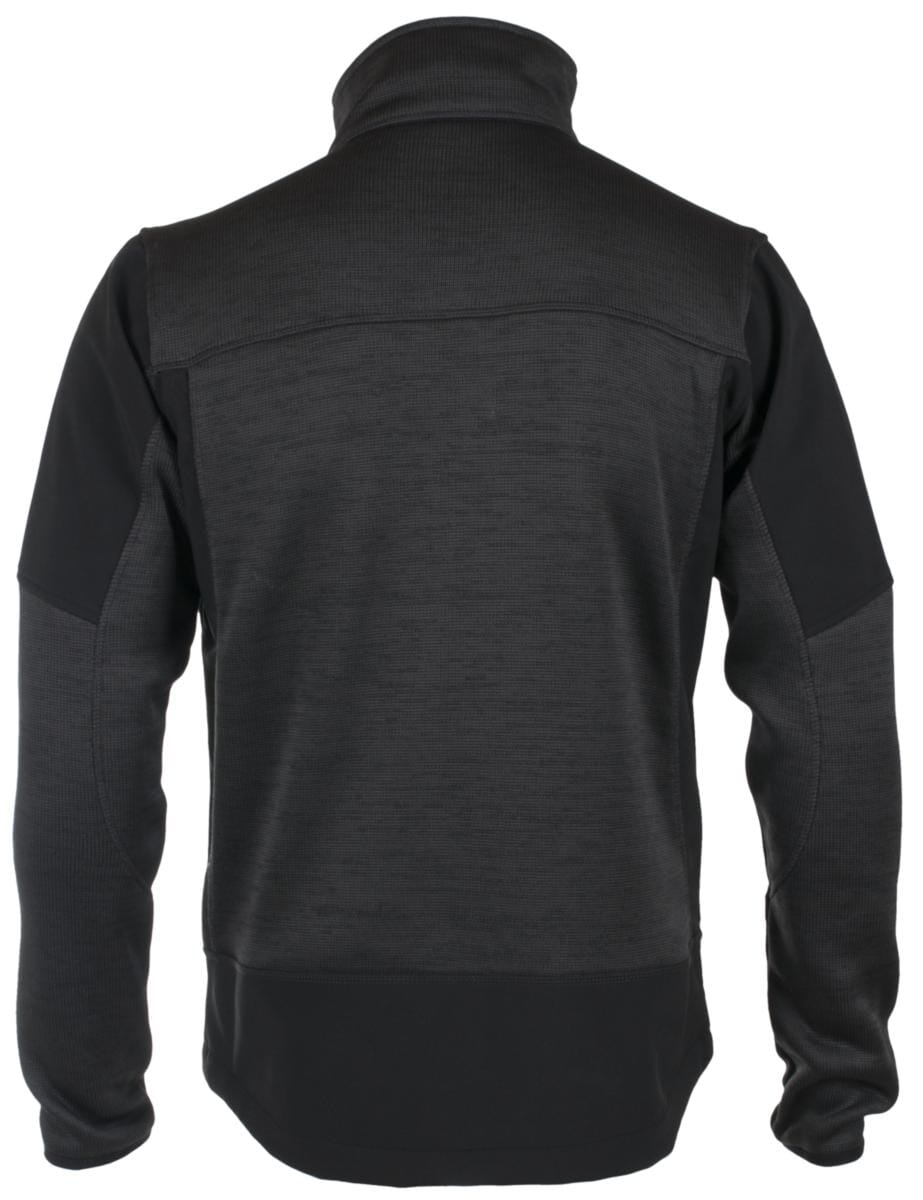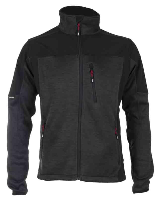 Jakke i strikket fleece. Kontraststoff i softshell i front, ermer, sidene og nedentil på rygg. Forlenget rygg. Høy krave med børstet fleece innside. YKK® glidelås i front som går helt opp i kraven. Lomme på venstre bryst med vertikal glidelås. To forlommer med vertikal glidelås. Elastisk strammesnor i linning. Ermeavslutning med elastikk, kantet med bånd. Nakkehempe.