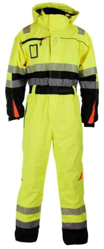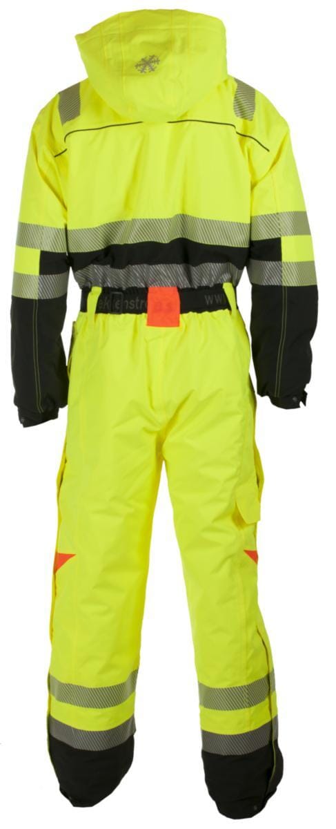 Bekken og Strøm Vinterkjeledress i funksjonelt design. Pustende, vind- og vanntett. Tapede sømmer. Vannsøyle 13 000 mm, pustende 4000 g/m²/24t. Høy krave med børstet fleece innside. To-veis YKK® glidelås i front som går helt opp i kraven, klaff med trykknapper. Hjelmtilpasset avtakbar vattert hette med skjerm, fult justerbar med to elastiske strammesnorer. Vattert fôr. Kartlomme med glidelås på venstre side under klaff. Brystlomme på høyre side med horisontal vanntett glidelås. Utvendig ID-kortlomme på høyre bryst. To innvendige brystlommer, begge med glidelås. To forlommer, begge med vanntett vertikal glidelås. Regulering av ermeavslutning med trykknapper og strikk. Pulsvarmer i ermeavslutning. Strikk og brede beltehemper i livet. Avtakbart belte med plastpenne. Tommestokklomme med drenering. Lang to-veis YKK® glidelås i ben med klaff med borrelås. Snølås med borrelås, trykknapp og strikk. Justering av benavslutning med trykknapp. 50 mm 3M Scotchlite™ segmentert transferrefleks på ermer, ben, skuldre, mage og bryst.
