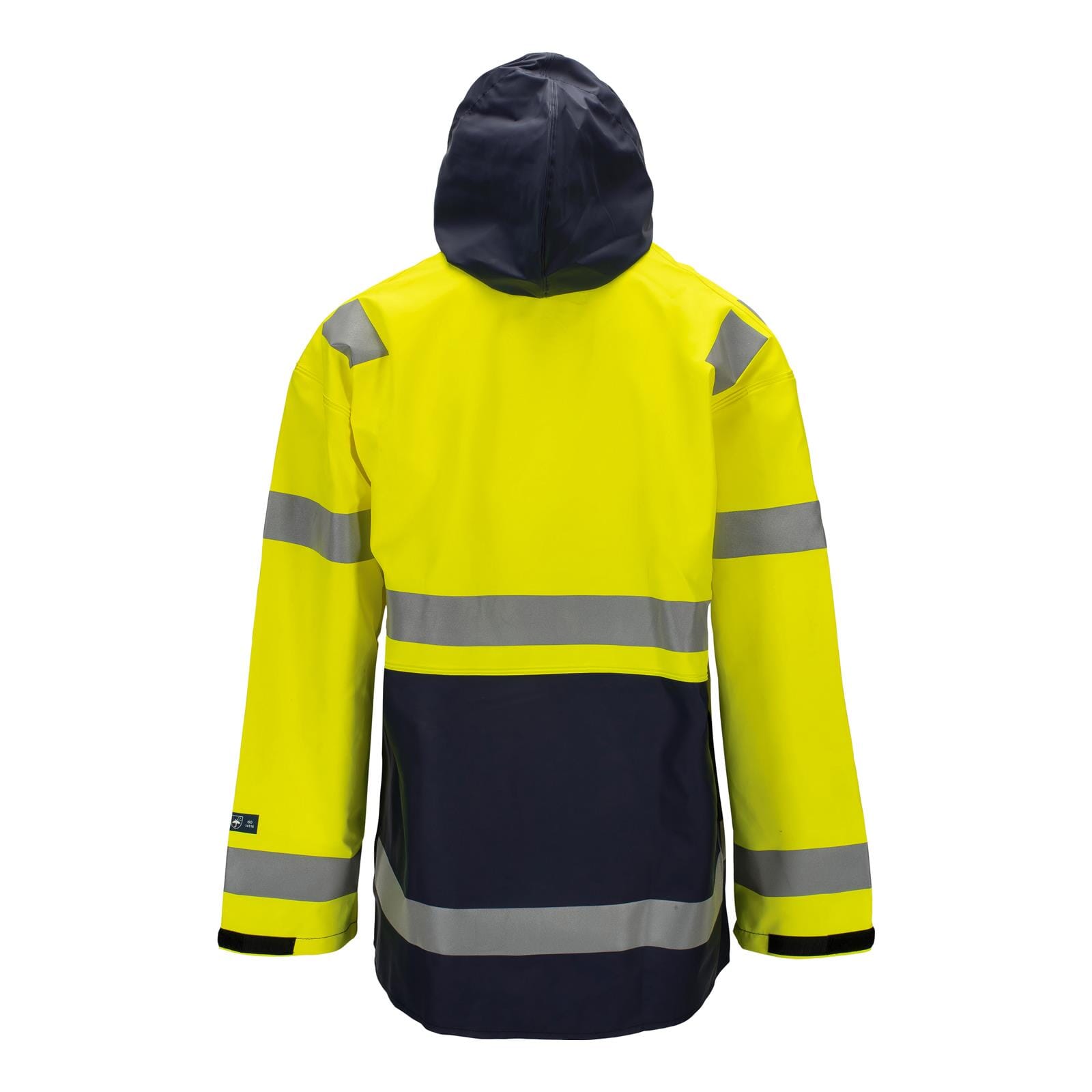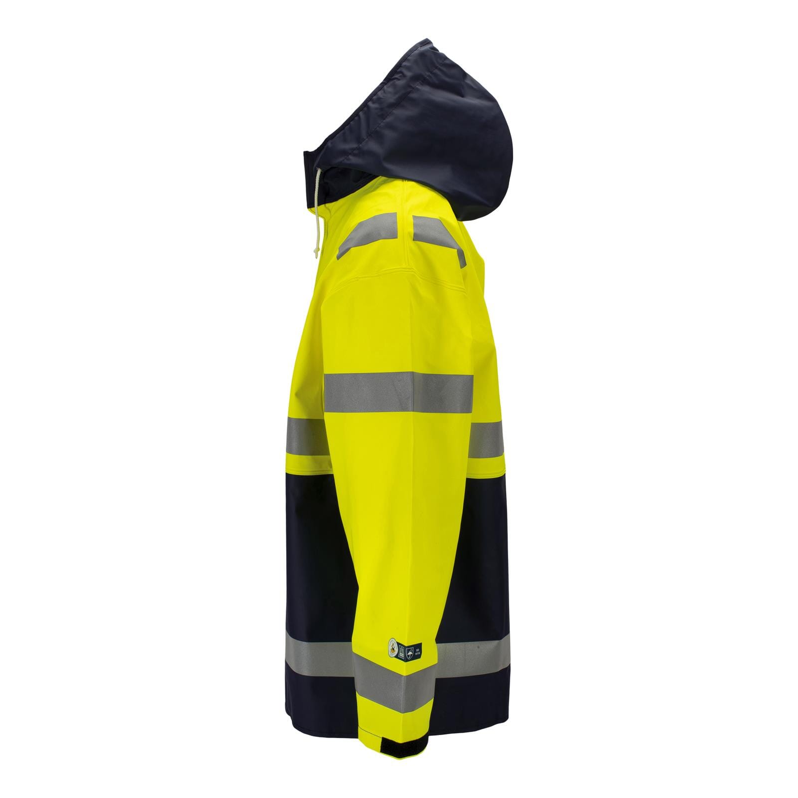 Aksla synlig regnjakke har hette med snor, justerbare ermer og trykknapper i metall i front. Sistnevnte er skjult med stormklaff. Jakken er også sertifisert i henhold til ISO 14116 for begrenset flammespredning.