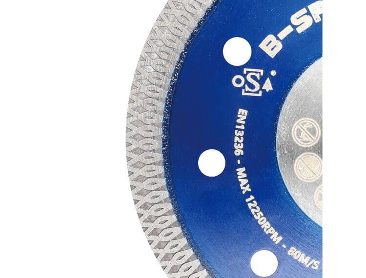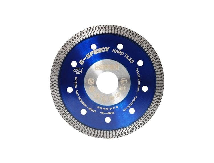 Proff mesh helbane blad for harde fliser, porcellanato. Gir et fint kutt med minimal riving i flisen. Tykkelse kun 1,2 mm gir mindre støv og raskere kutt. Forsterket i midten med 55 mm dobbel flens. Laget i spesialstål for ekstra stivhet. Diameter 125 mm – senterhull 22,2 mm.
