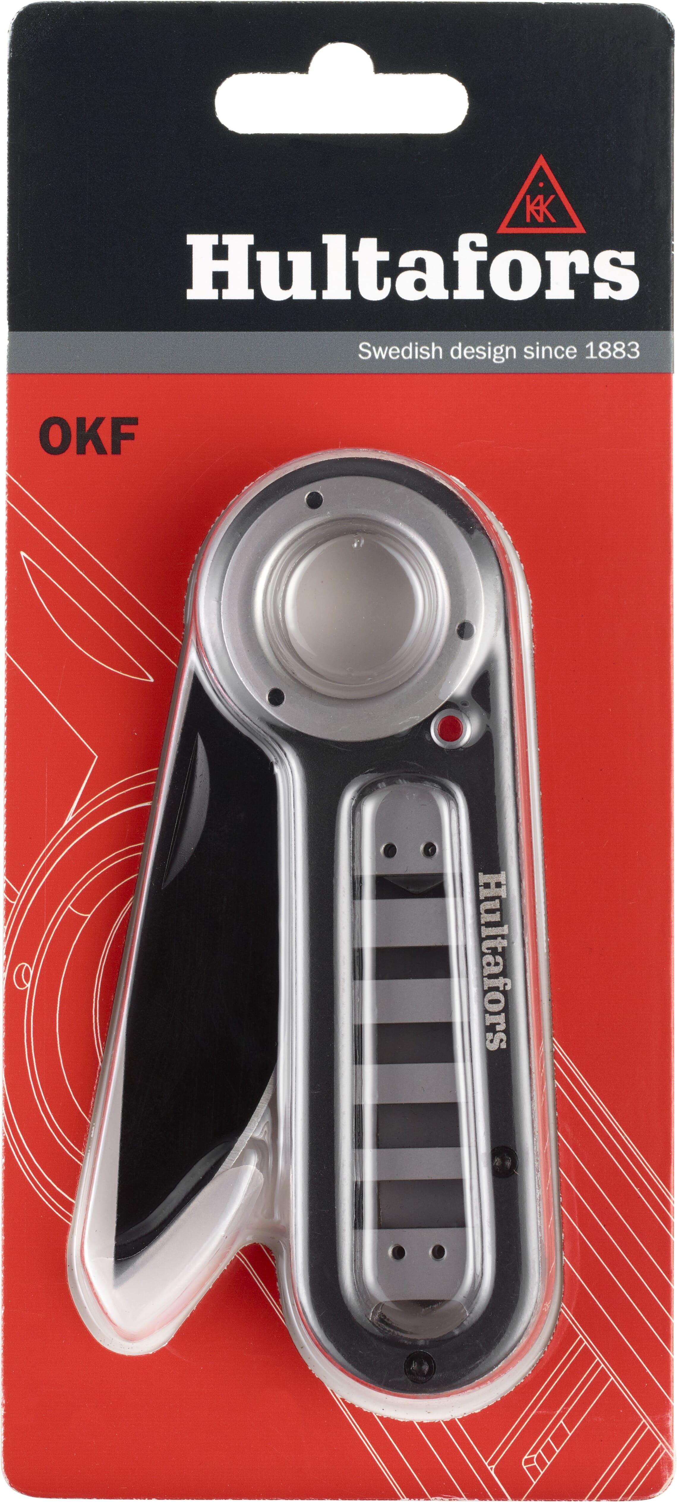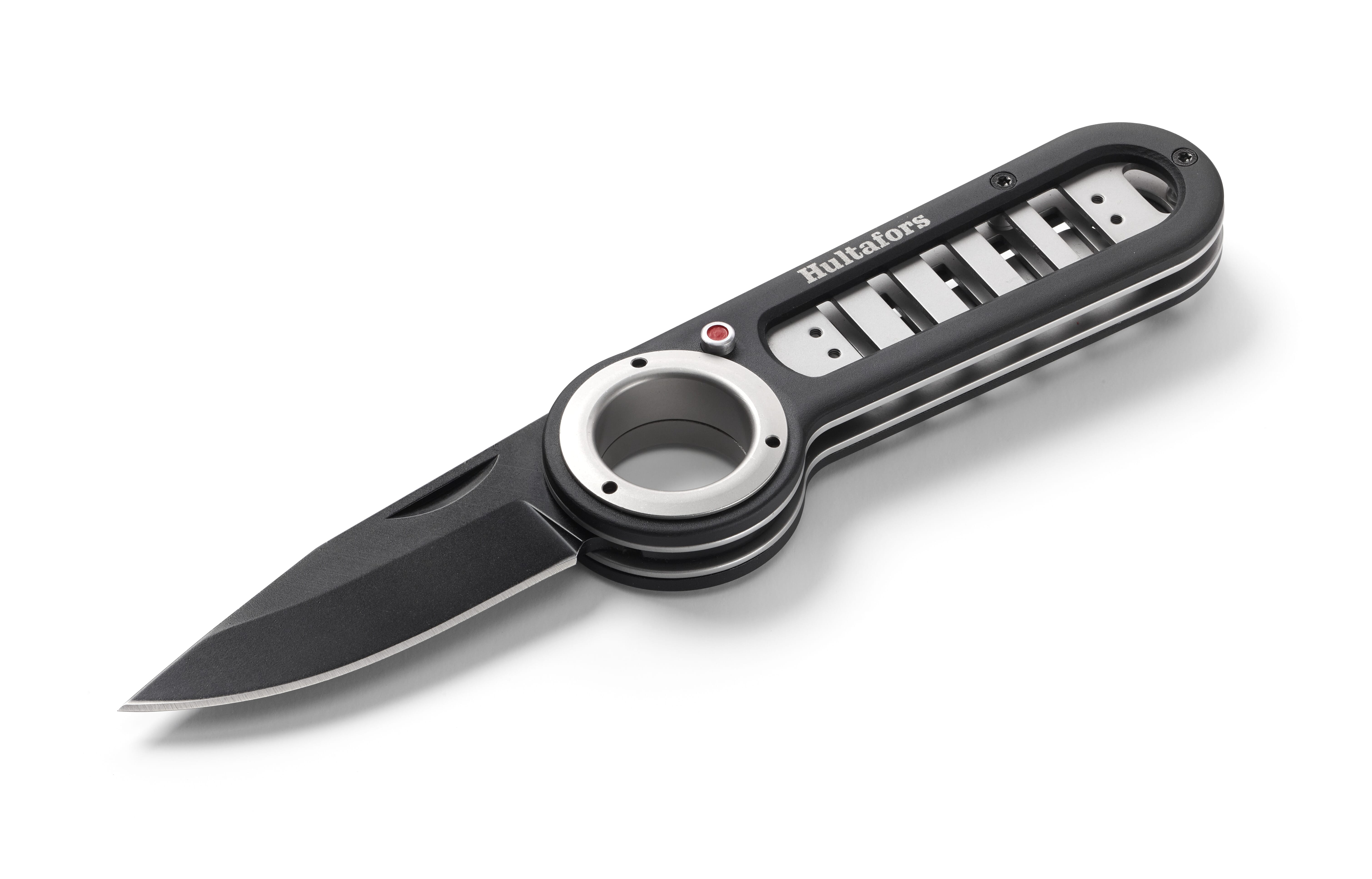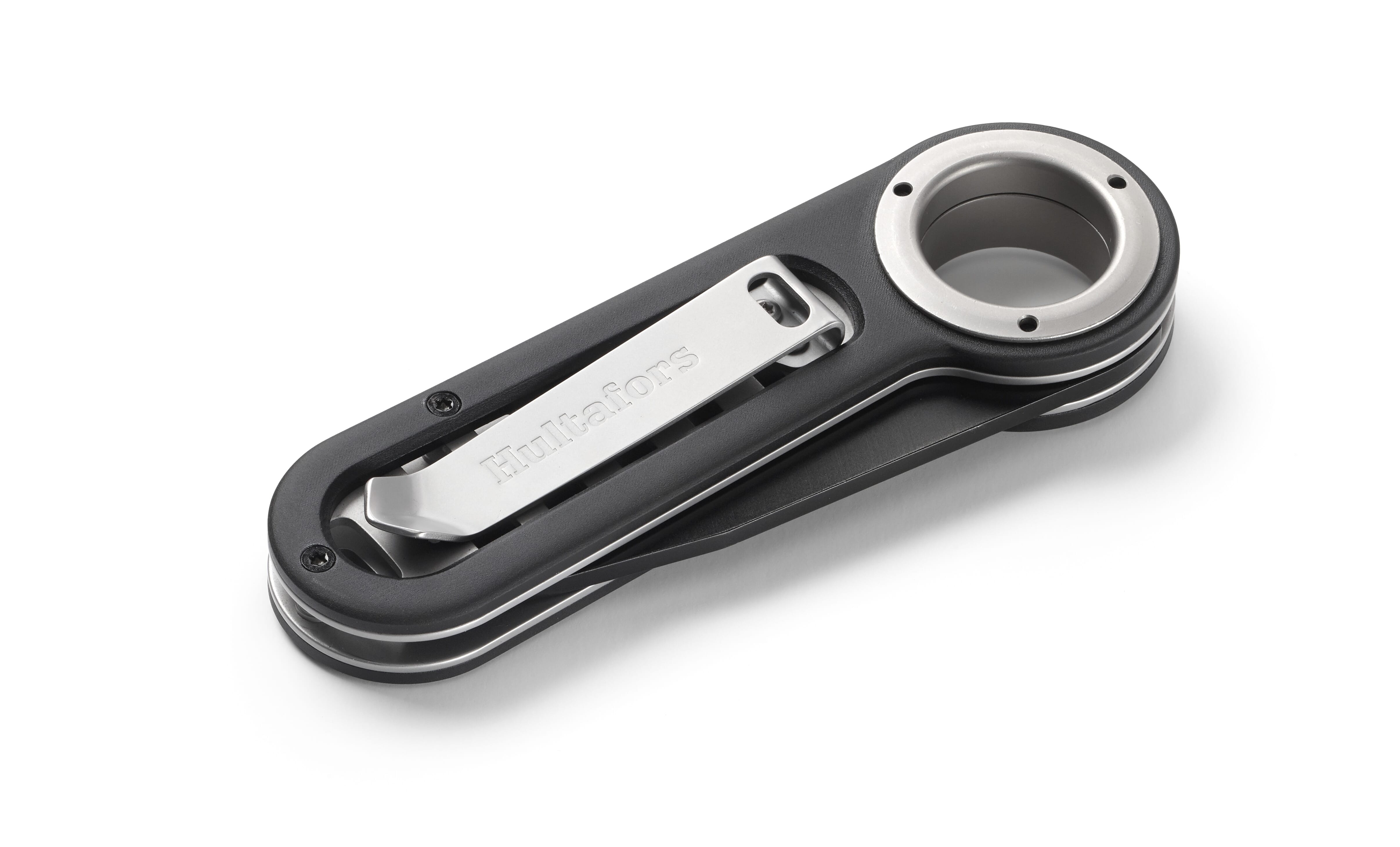 Robust foldekniv av svartbelagt aluminium med deler av rustfritt stål og et svart blad i rustfritt knivstål. Den perfekte følgesvennen i skogen og på fisketuren. Kompakt design med mange bruksområder. Bladet låses enkelt og trygt med en knapp på siden av skaftet. Beltefestet kan snus og monteres på begge sider av skaftet. Det gjør at du kan velge hvor du vil feste kniven – til et belte eller på innsiden av en lomme. Kniven kan brukes sammen med Hultafors Tennstål.