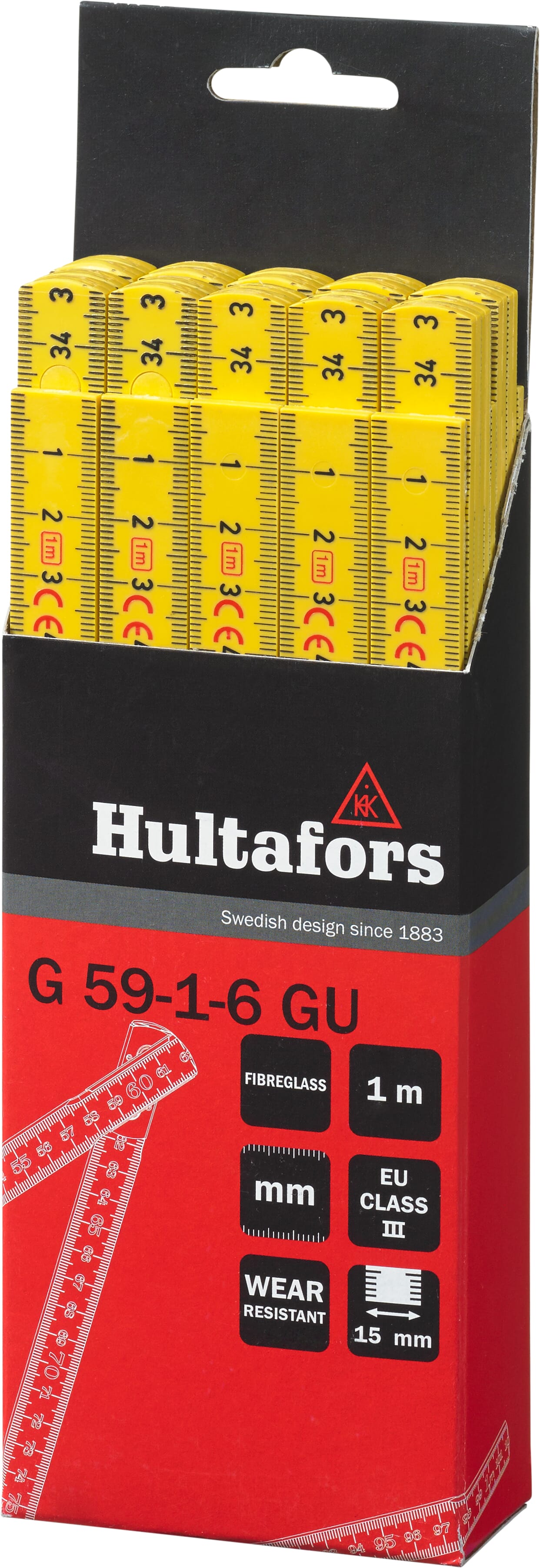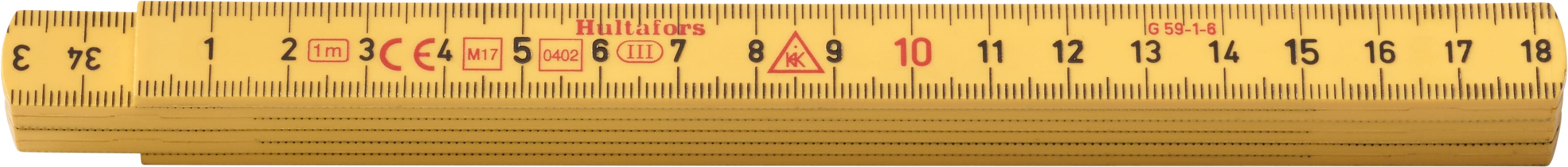 Meterstokk produsert av glassfiberforsterket polyamid, som gir økt motstand mot fukt. Metrisk gradering i svart på begge sider og røde desimetertall.