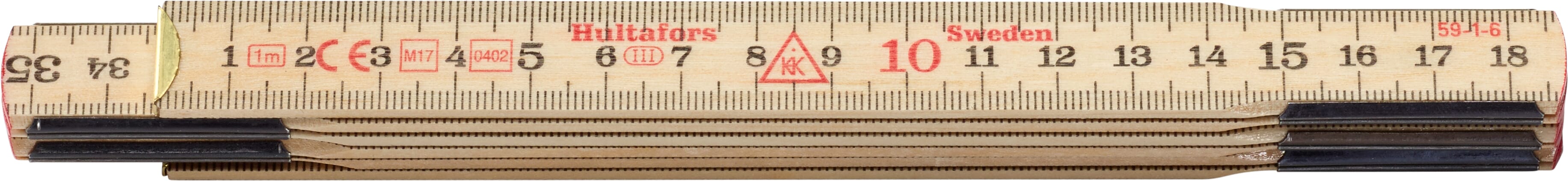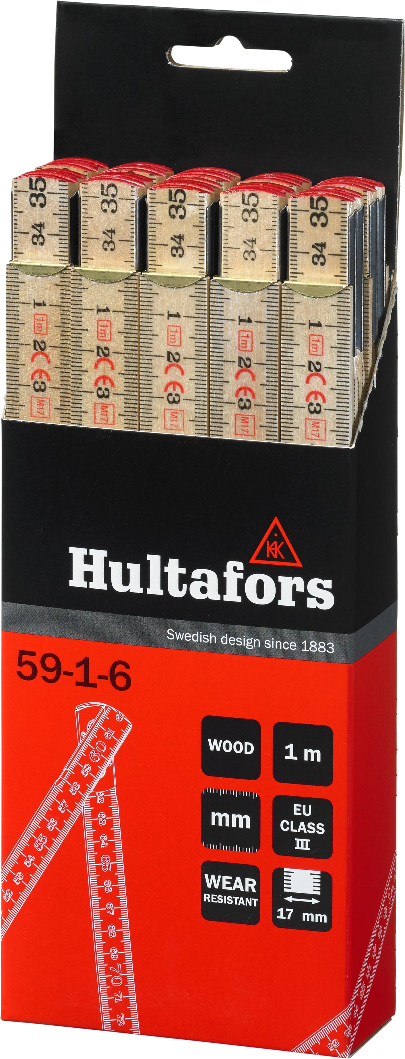 Hultafors klassiker, en nødvendighet for alle håndverkere. Tradisjonelt produsert av glassbjerk med ledd av svensk stål, som gjør det mulig å ha tynne stikker og en smidig meterstokk. Metrisk gradering i svart på begge sider med røde desimaltall.