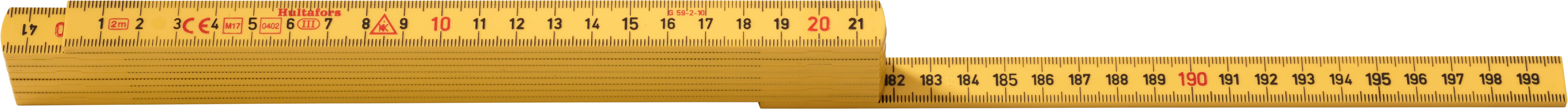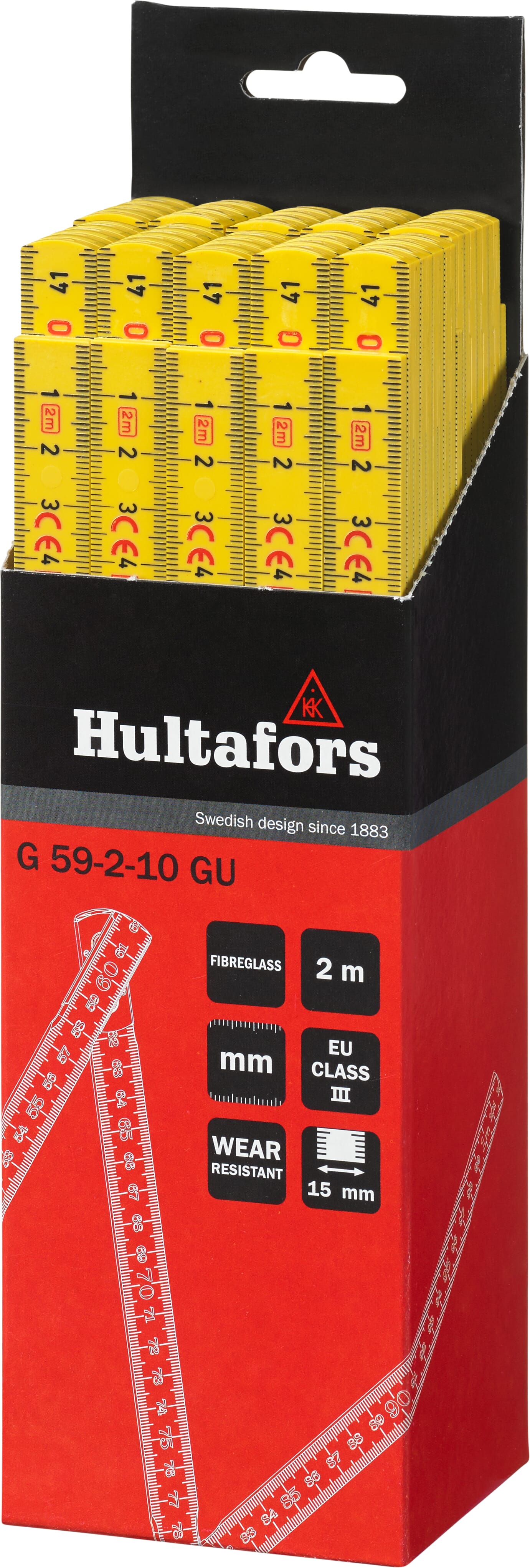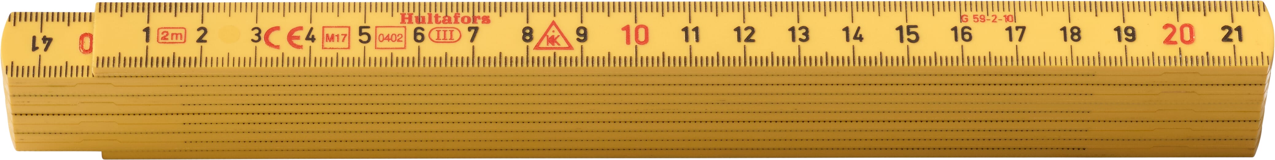 Meterstokk produsert av glassfiberforsterket polyamid, som gir økt motstand mot fukt. Metrisk gradering i svart på begge sider og røde desimetertall.