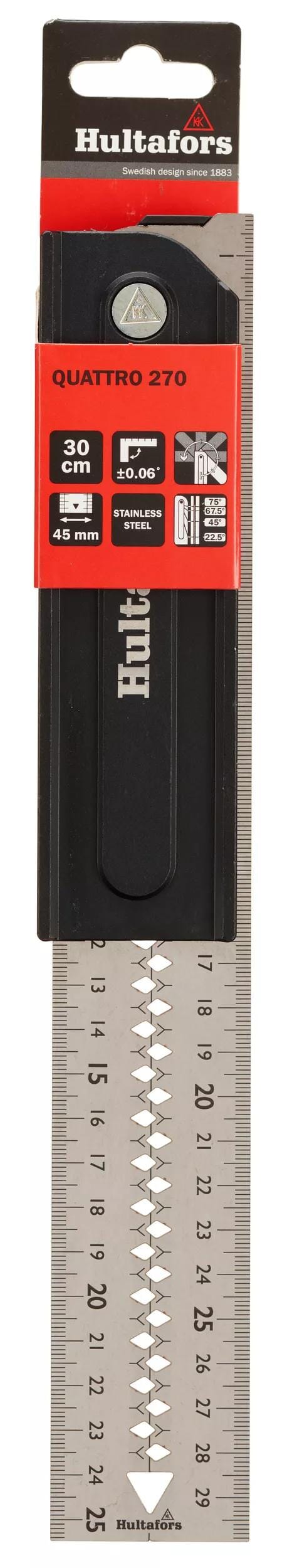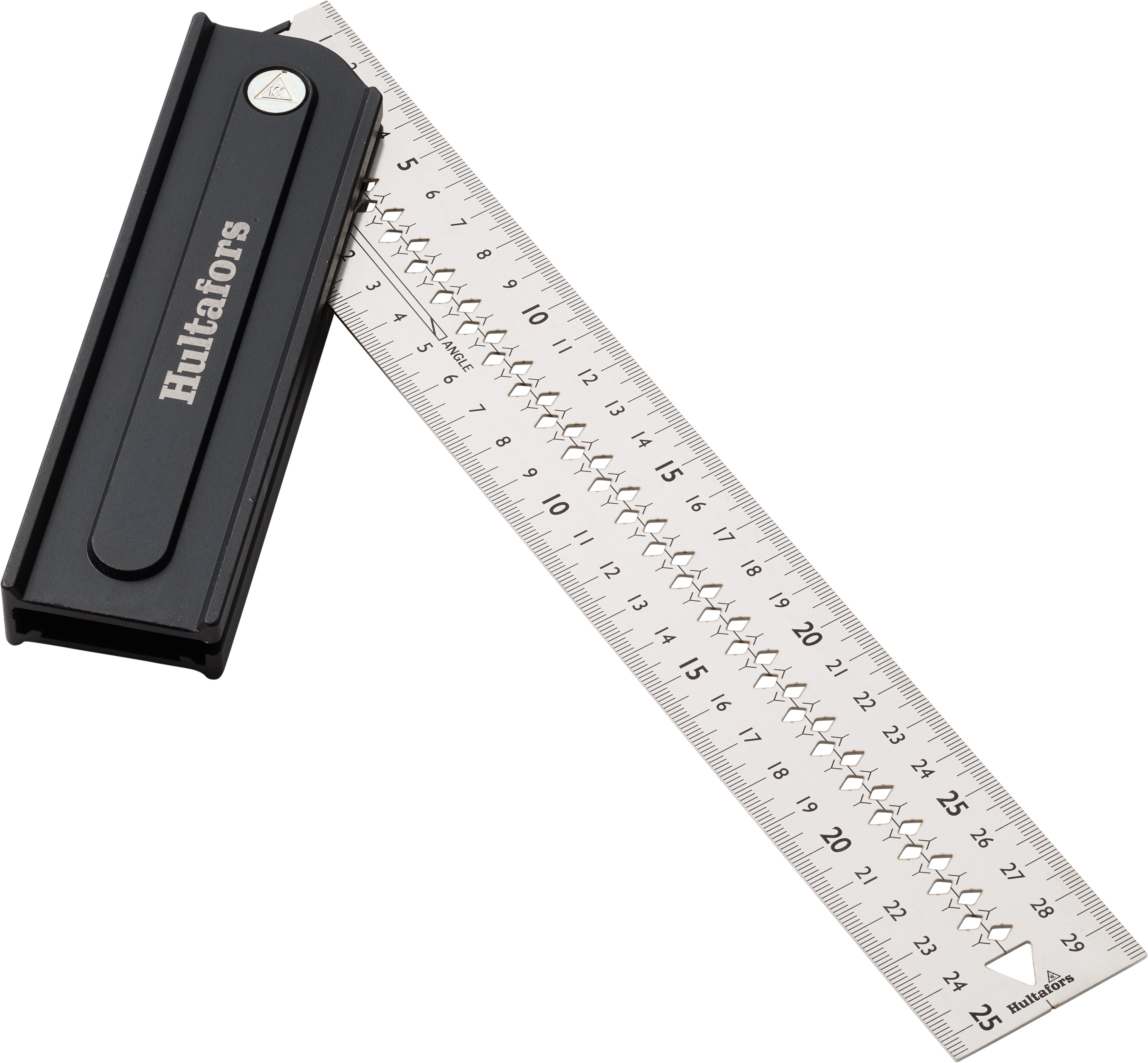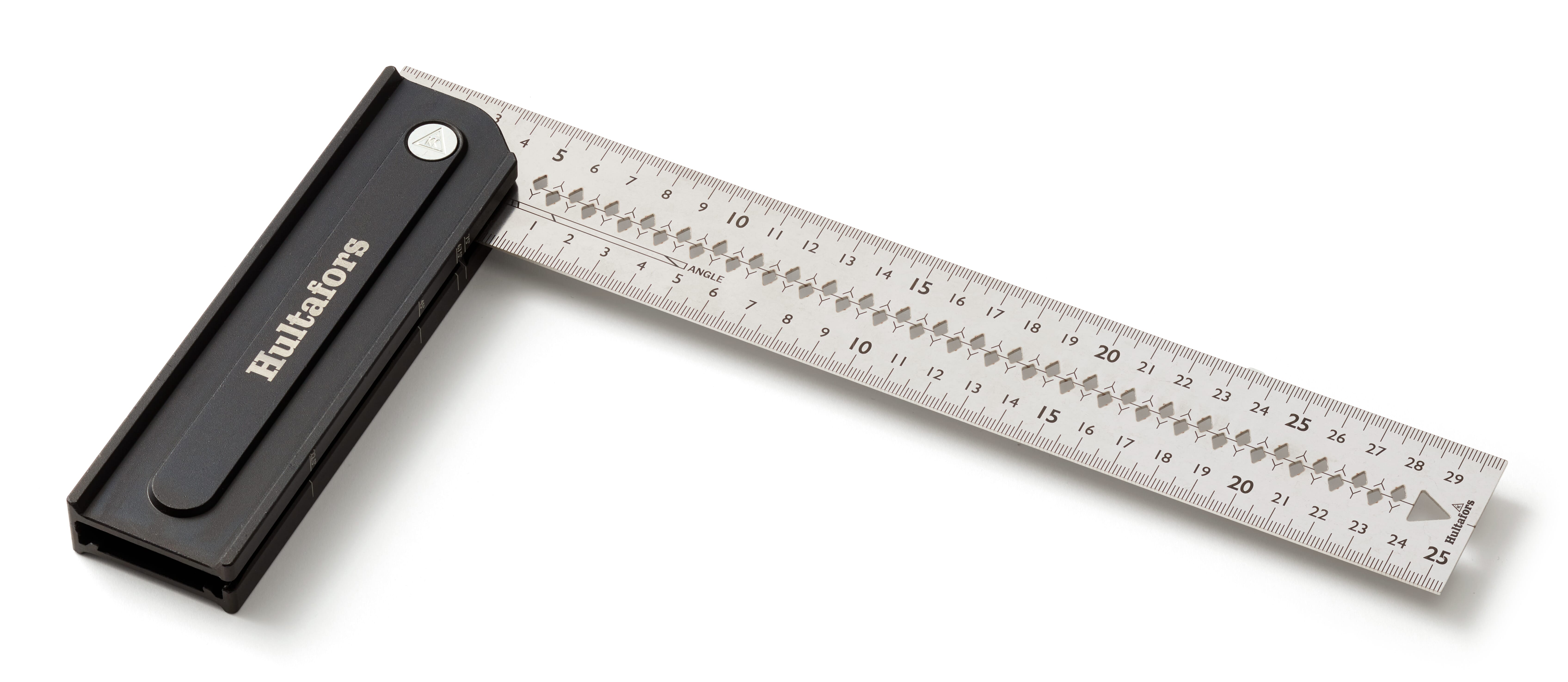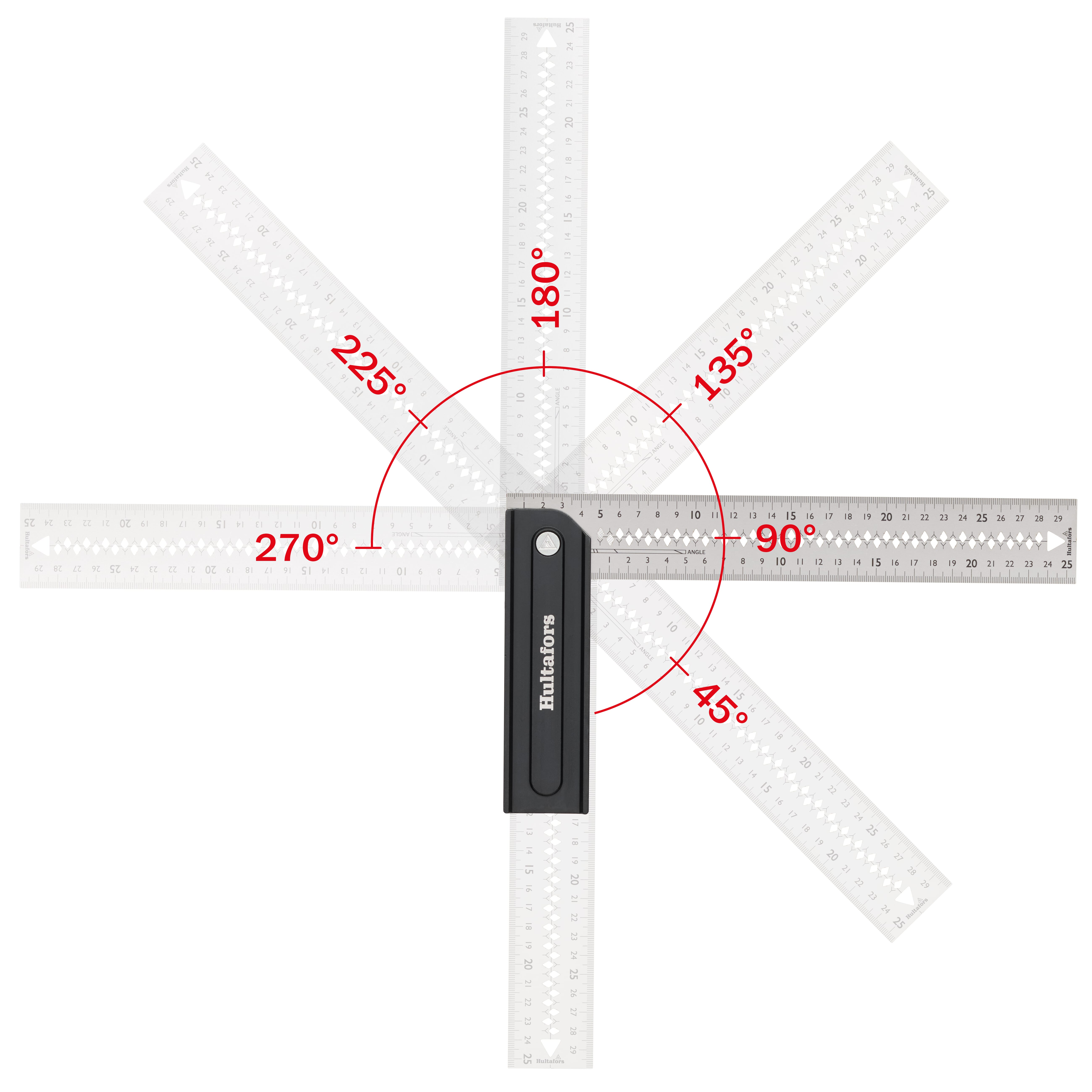 En patentert vinkel med et blad som kan roteres til 45°, 90° og 135°. Den kan også roteres 270 grader, som gjør det mulig å bruke den glatte baksiden, slik at man unngår at tynne metalldeler fester seg på feil sted. I tillegg er det markeringer for 22,5°, 67,5° og 75°/15°. Vinkelen kan også foldes sammen, noe som gjør den enkel å bære med seg i lommen på arbeidsbuksen. Klingen er 45 mm bred for å lette arbeid med standard stenderdimensjoner og har en midtlinje som gjør det raskt og enkelt å merke begge sidene av en stender. Klingen har også rissespor med 5 mm avstand, som kan brukes til å streke opp eller skjære en linje parallelt langs en kant. Vinkelen har et skarpt ytterhjørne, som andre justerbare vinkler ikke har. Hvis du roterer klingen 270° får du et avrundet hjørne, slik at du lettere kommer til i ujevne hjørner. Et robust ledd og en klinge av 1 mm tykt rustfritt stål gir et svært holdbart design som tåler tøffe arbeidsmiljøer. Nøye utvalgte materialer og produksjonsteknikker, slik som CNC-frest anslag og klinge skåret ut med laser, gir stor nøyaktighet; vinkeltoleranse ±0,06° (±1 mm/m).