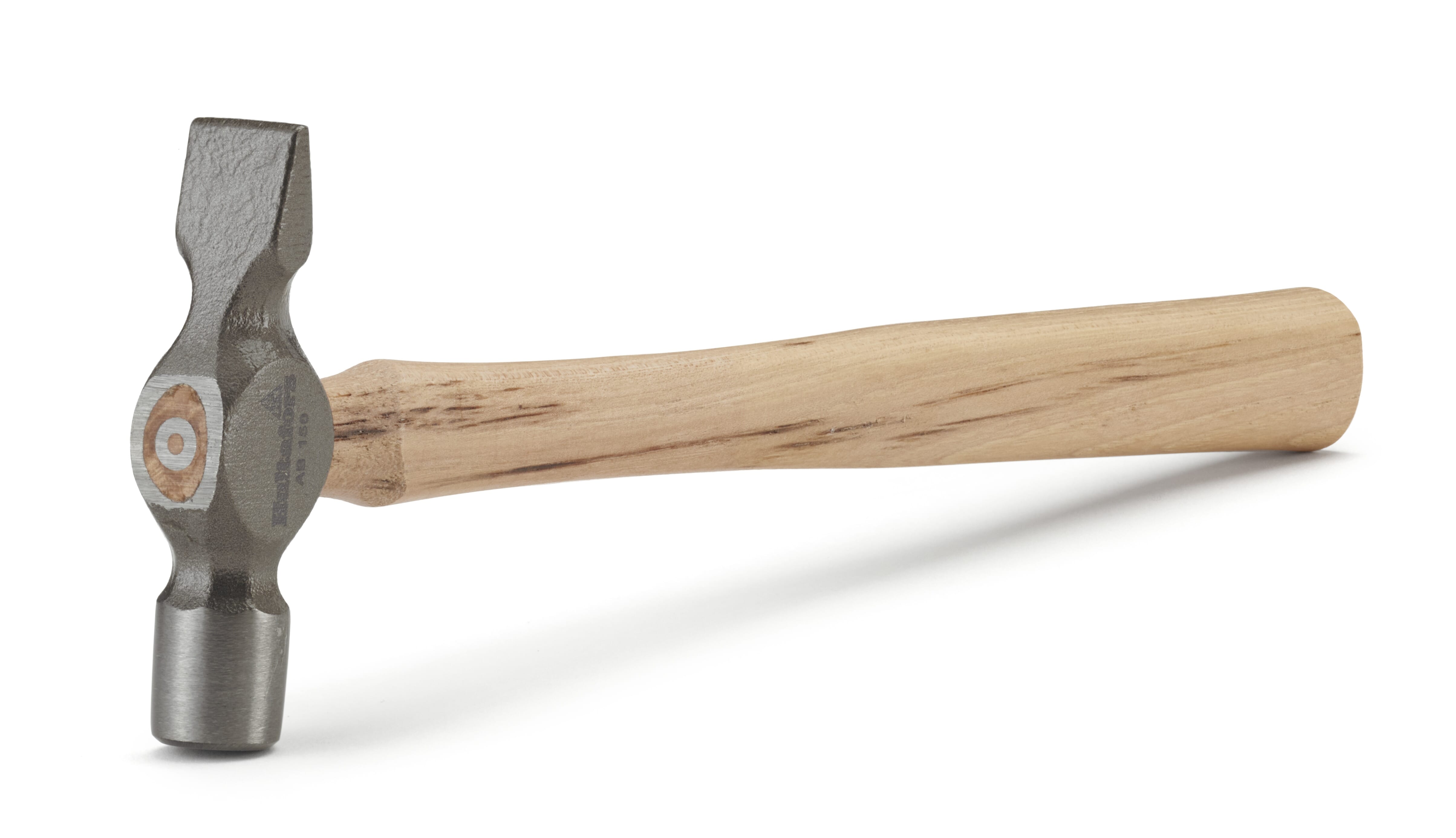 Håndsmidd, sandblåst og klarlakkert hammer, med herdet slagflate og lang penn. Treskaft av hickory.