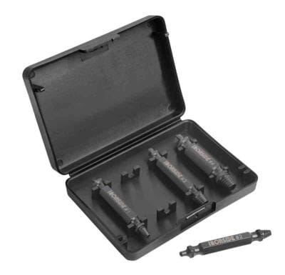 Sett med fire vendbare bits i robust MS-stål, spesialdesign for sikring av skadde eller ødelagte skruer. Skru biten mot klokken, bor hull, snu og dra ut – alt i en kompakt pakke.
