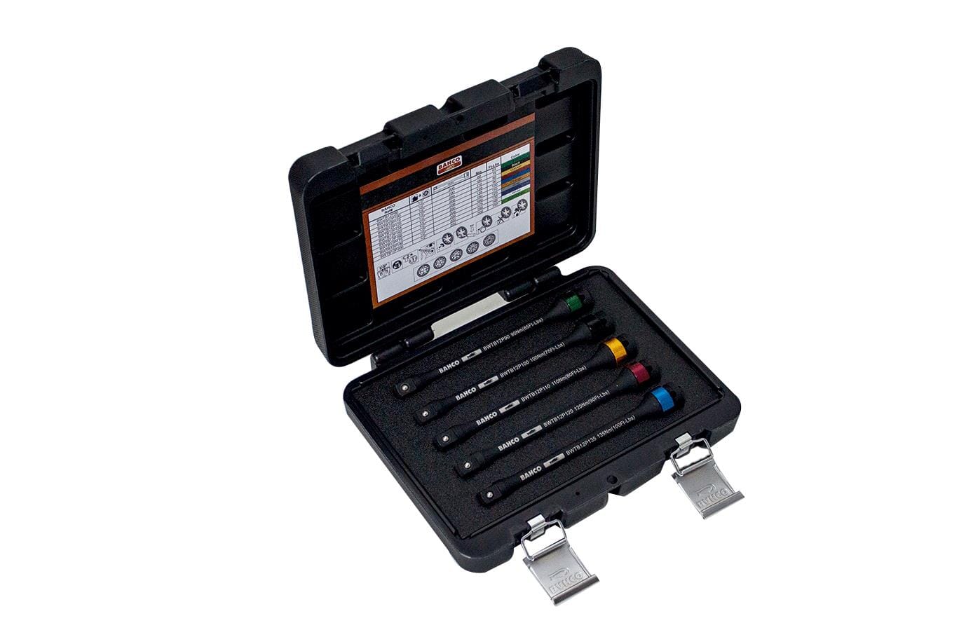 Omfatter fem momentstaver med fargekodede ringer for rask identifikasjon av maksimal momentverdi